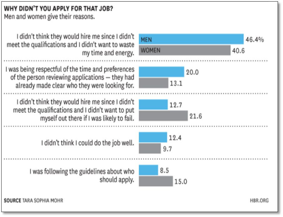 Here’s the factor that struck me as a significant difference between men and women who responded: “I didn’t think they would hire me and I didn’t want to put myself out there if I was likely to fail.” Women cited fear of failure at a rate of 70 percent more often than men.